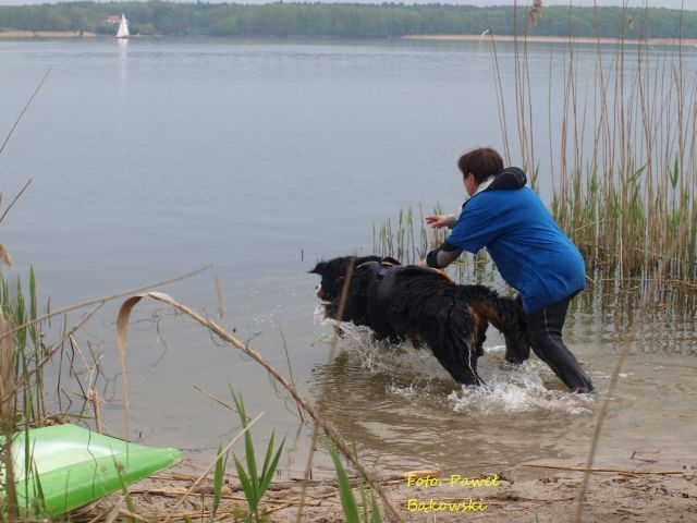 Manekin wypada z łodzi, pies ma wyskoczyć na komendę i przyholować do łodzi.